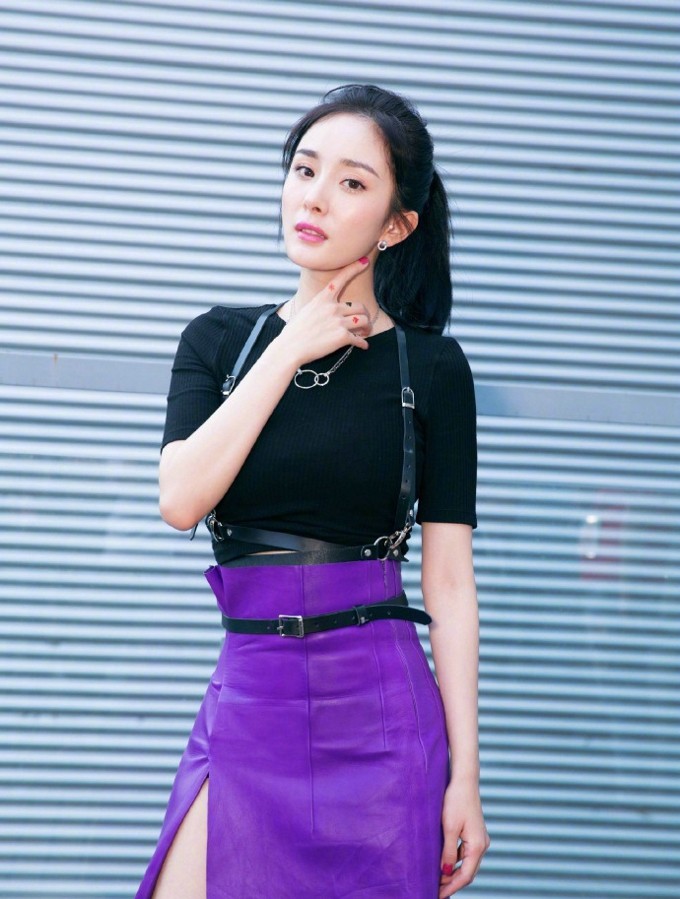 杨幂黑色毛衣邂逅紫色长裙 刚柔并济演绎时尚美学