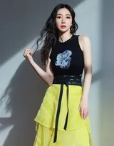 如果说黑色展现了柳岩的深邃一面,那么明亮的黄色则释放了她身上清新与温柔的能量。写真中,她身着一袭黄色连衣裙,微卷的秀发披肩,营造出慵懒又充满女人味的春日氛围。黄色是一种颇为挑人的色彩,对肤色要求极高,但柳岩凭借白皙的肌肤与良好的状态,将其驾驭得恰到好处,既明媚动人又不显突兀。裙身巧妙拼接的白色领口与腰间精致的白色蝴蝶结腰带,更是点睛之笔,不仅丰富了视觉层次,更带来了一种恰到好处的减龄感与甜美俏皮。