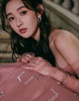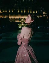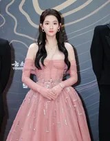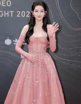 粉色作为主色调,为整个造型奠定了浪漫唯美的基调。这种饱和度适中的粉色,不仅衬托出她白皙通透的肌肤,更避免了过于甜腻的感觉,反而注入了几分温柔与高级感。礼服的细节之处同样值得称道,从抹胸边缘的精致缝线到裙身若隐若现的细腻光泽,无不体现着高级定制般的工艺水准。搭配上她简约的饰品和清爽的妆发,整体造型重点突出,繁简得当,更显气质脱俗。