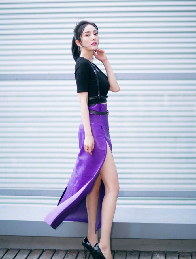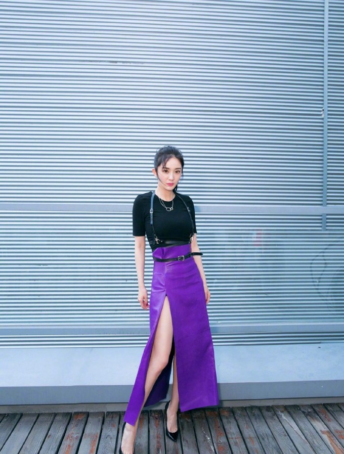 杨幂黑色毛衣邂逅紫色长裙 刚柔并济演绎时尚美学