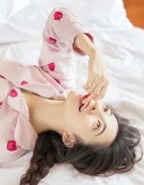 她的穿搭同样诠释了居家时的舒适与甜美。一件橘粉色调的短袖上衣,搭配同色系或白色的短裤,构成了清爽又柔和的视觉主体。这种宽松柔软的睡衣或居家服,是彻底放松身心的最佳选择。没有紧绷的束缚,只有被柔软面料包裹的惬意,这与她在私人空间里享受独处时光的状态完美契合。温暖的阳光透过窗帘,在她身上洒下一层淡淡的光晕,让整个人看起来更加柔和明媚,散发着一种慵懒而甜美的气息。