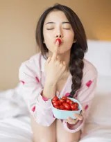 动态的“吃”这个动作,为静态的画面注入了鲜活的生活感。圣女果,这种小巧鲜红的水果,在她手中成了最好的道具。她或专注地品尝,或俏皮地凝视,眼神中闪烁着轻松愉悦的光芒。这个简单的行为,瞬间拉近了与观者的距离,让我们联想到自己某个同样放松的周末早晨——赖在床上,享受着一份清甜的水果,任由时间缓慢流淌。这份自然而然的“吃货”属性,非但没有折损她的甜美,反而让这份甜美更加真实、可亲,充满了“酸酸甜甜”的生动魅力。