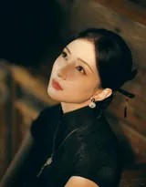这组写真中的核心,是那件剪裁极佳的黑色旗袍。深邃的墨色并非单调,其面料隐约流转着真丝特有的温润光泽,如同静谧夜空下的暗涌,沉稳中藏着华美。黑色本身便是高贵与神秘的化身,而旗袍的立领、盘扣、开叉等经典元素,则为其注入了纯粹的中式基因。尤为点睛的是旗袍上精致的提花图案,据资料描述,可能是象征富贵吉祥的牡丹纹样,于行走摆动间若隐若现,恰似在夜色中悄然绽放的暗夜牡丹,让整体造型在简约中见繁复,于低调处显华贵。
