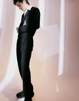 画面的构图与光影处理,极大地强化了主题。摄影师大量运用明暗对比,让光线如同雕刻刀般塑造出他清晰的面部轮廓和身体线条。阴影处隐藏细节,亮处突出神情,营造出强烈的戏剧感和电影氛围。场景选择上,简约而富有质感的现代空间,与融合风格的服饰相得益彰,让观者焦点完全集中于人物及其服饰所承载的情感与故事。