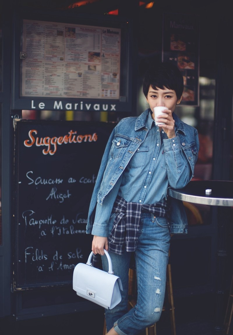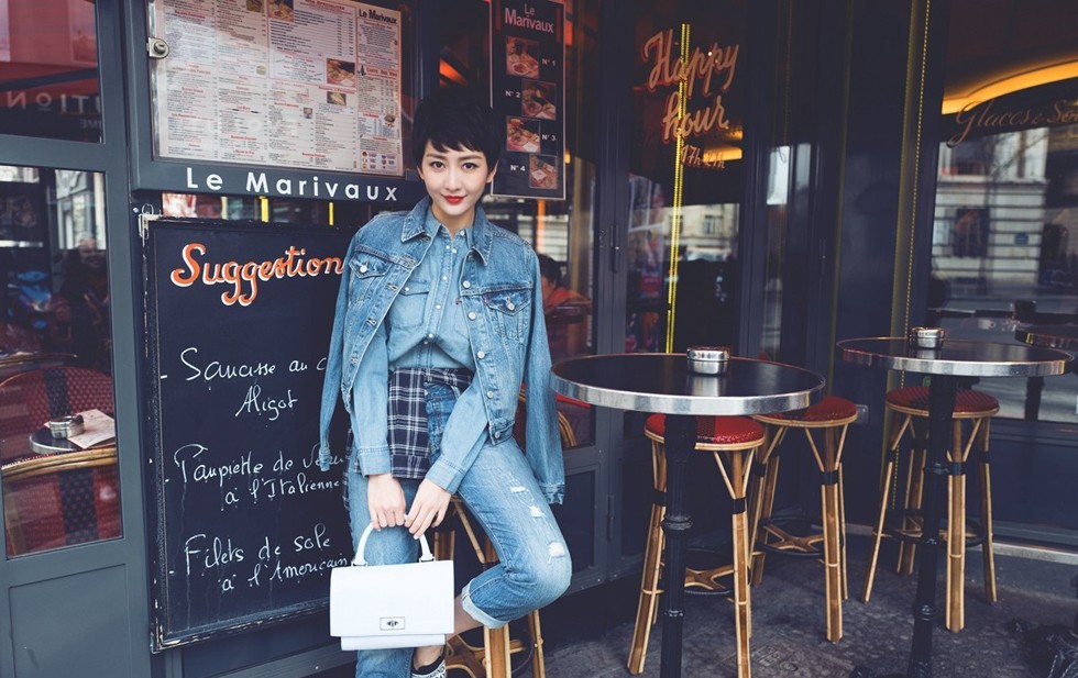 王鸥一身牛仔装于巴黎咖啡店前驻足,短发红唇在阳光下展露明媚笑容