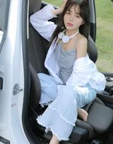 仔细观察这些照片,你会发现光线的运用堪称精妙。自然光从车窗斜射而入,有时形成柔和的光斑轻抚她的脸颊,有时则勾勒出精致的面部轮廓,让皮肤呈现出细腻的质感。在逆光或侧逆光下,她的发丝仿佛被点亮,泛起朦胧的光晕,这进一步柔化了整个画面,与她温柔的眼神相得益彰。这种对光影的驾驭,使得每一张照片都洋溢着电影剧照般的叙事氛围,让人不禁猜想镜头之外的故事。