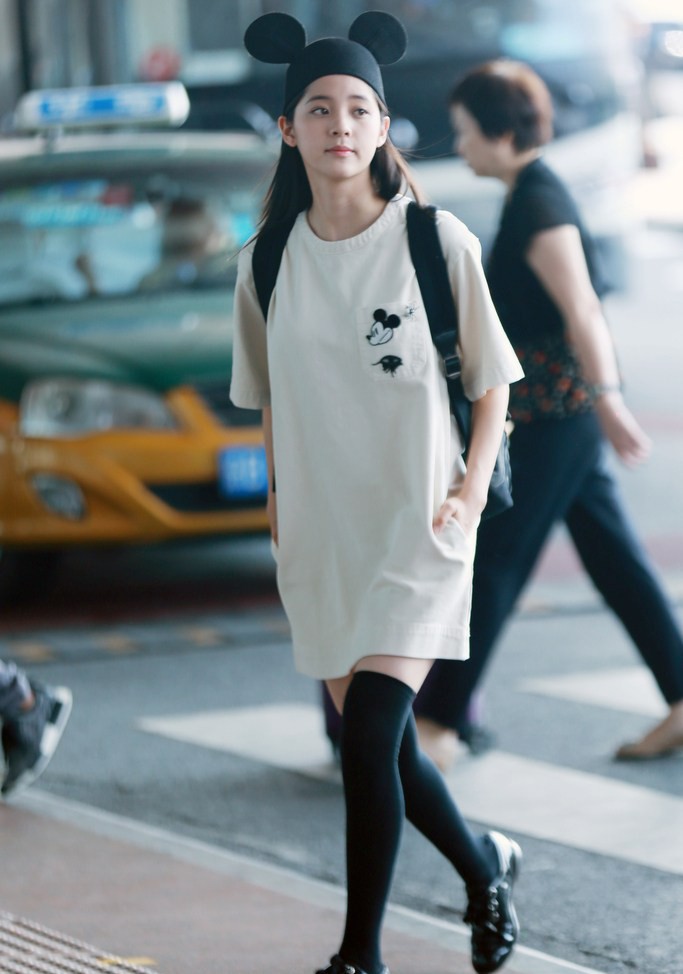 此次纽约之行,欧阳娜娜是受著名品牌Marc Jacobs邀请,前往观看其2017春夏大秀。或许是为了呼应这场时尚盛会,她在机场的“变装秀”也格外用心。第一套造型便充满了童趣与活力,她头戴一顶黑色的米奇耳朵毛线帽,瞬间点亮了整套穿搭,显得俏皮又灵动。身穿Marc Jacobs的长款T恤裙,外搭同品牌的棒球夹克外套,肩上背着一款时髦的Shutter相机包。这套搭配完美融合了运动休闲与少女感,她脸上洋溢的灿烂笑容和满满的胶原蛋白,更是诠释了何为“青春无敌”。