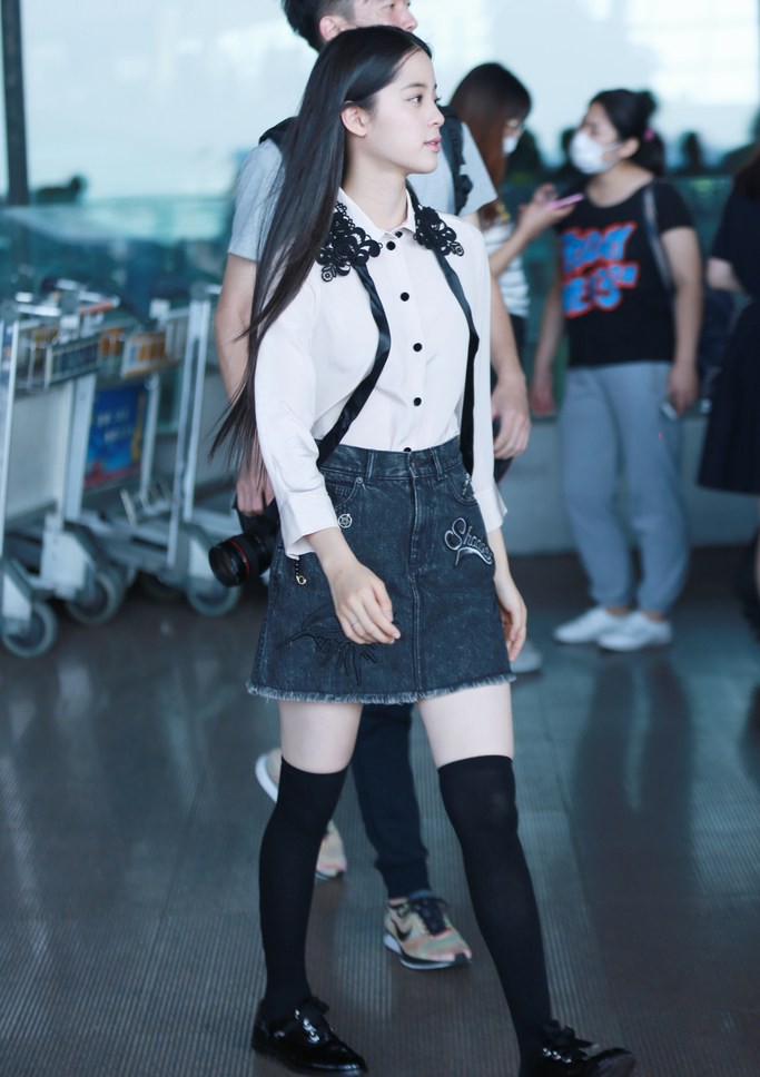 紧接着,欧阳娜娜迅速换上了第二套风格迥异的造型。她脱下了棒球外套,展示出内搭的Marc Jacobs 2016秋冬系列单品:一件米白色、领口带有精致刺绣装饰的衬衫,下身则是一条贴布装饰的牛仔短裙。这套搭配通过衬衫的清新与牛仔短裙的率性相结合,碰撞出了不一样的时尚火花。特别是她搭配的过膝长袜和漆皮平底鞋,更是点睛之笔,瞬间强化了整体造型的学院风与日系少女感,显得元气满满。这也展示了欧阳娜娜在驾驭不同风格上的潜力,从动感活泼到清新文艺,切换自如。